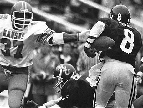 Cornerback Kenneth Johnson ended another Kansas drive by intercepting a Smith bomb on the State 3-yard.