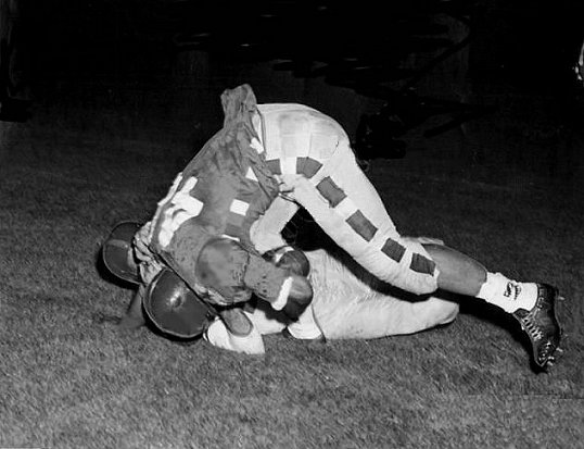 Don Shinnick (48) of UCLA is brought down by Giants' Dick Nolan.