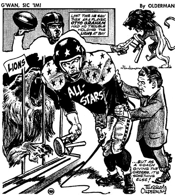 In the third period, after Lou Michaels of Kentucky led a swarm of All-Stars in tackling Rote behind his goal for a safety, the Lions opened up. Gene Gedman was the star of the march and slid nine yards off left end for the score.