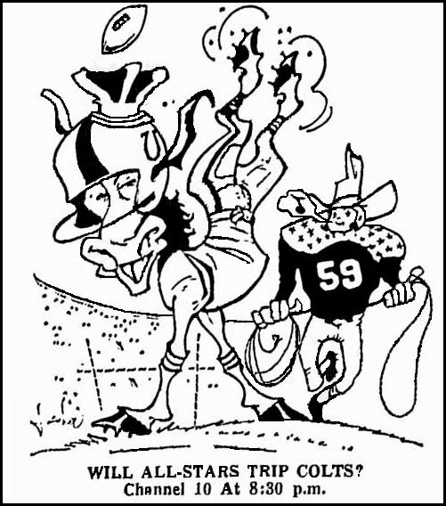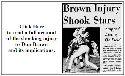 "Brown went out for a hookpass." explained Lee Grosscup of Utah, the starting All Star quarterback. "He was supposed to swing tight. I think one of the Colts' pluggers clotheslined him (accidentally hit him across the throat.)