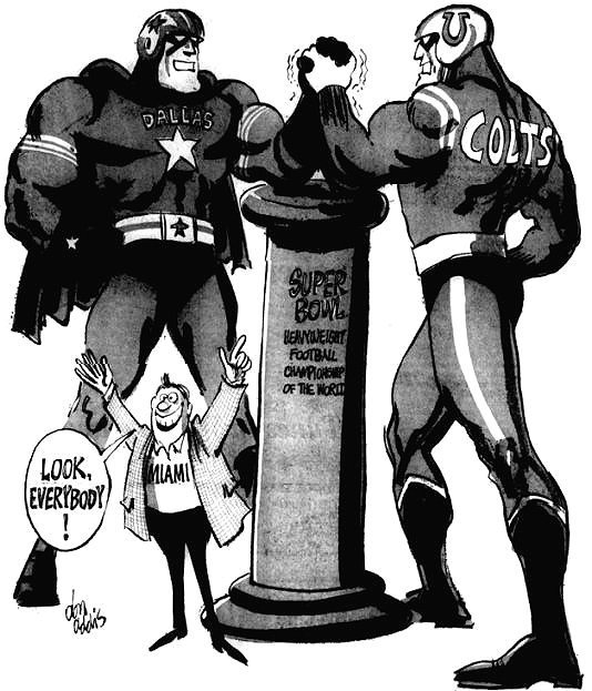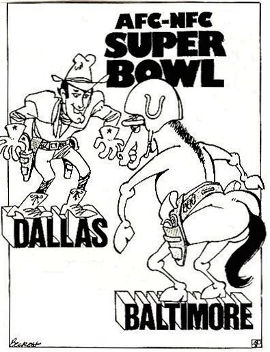 The Colts and Cowboys were dominant teams from 1968 to 1971, both coming from the NFL in that merger season Super Bowl. But, this cartoon was inspired by the upcoming Ali-Frazier fight which had captured the nation's attention.