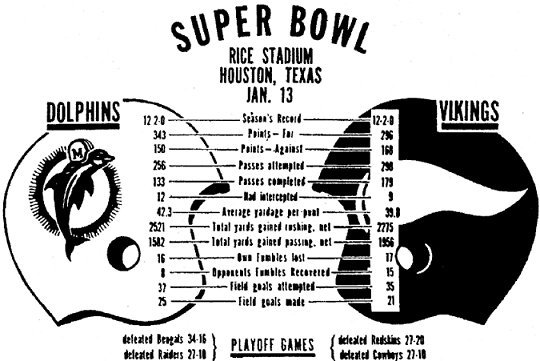 A major story of Super Bowl VIII was the Vikings having to practice at an inadequate high school playing field, while the Dolphins practiced at the Houston Oilers' facilities. Vikings' Coach Bud Grant was enraged and spoke out. He was reprimanded by Pete Rozelle.