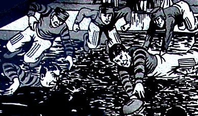 First man to reach the water's edge was an Aggie. He grabbed a stick and tried to reach the ball with it. A Sooner, charged with momentum, came crashing into the Aggie's backside and knocked the man into the water. Then he dived in after him, and both were desperately treading water toward the floating ball when it occurred to the Sooner to duck the Aggie. The Aggie, waterlogged, headed for shore then. The Sooner kept after the ball; they say he couldn't swim a stroke. The delighted spectators stood on shore cheering and laughing.