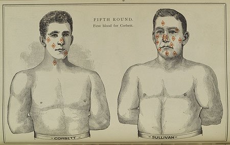 The diagram above shows the punches that landed in the fifth round. Note that Corbett drew blood for the first time in the fight with a shot to Sullivan's nose.