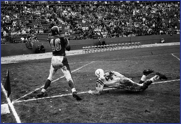 The Colts battled and never gave up. They led off with a spectacular 62-yard pass from Johnny Unitas to end Ray Berry and three plays later scored on a 2-yard flip from Unitas to Lenny Monro.