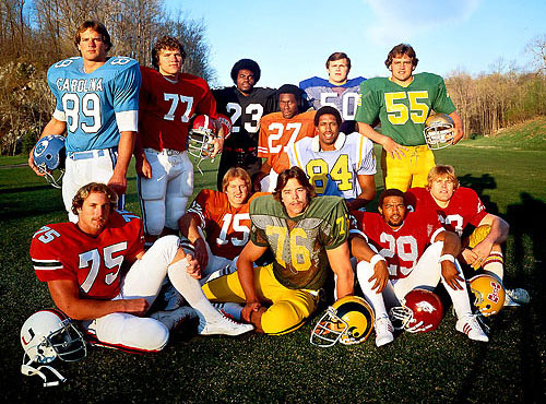 Left to right, top row: Ken Sheets (89), lineman, North Carolina; Barry Krauss (77), linebacker, Alabama; Henry Williams (23), back, San Diego State; Johnnie Johnson (27), back, Texas; Jerry Robinson (84), linebacker, University of California at Los Angeles; Jim Kovach (50), linebacker, Kentucky; Bob Golic (55), linebacker, Notre Dame. Sitting: Don Smith (75), lineman, Miami (Florida); Russell Erxleben (15), punter, Texas; Mike Bell (76), lineman, Colorado State; Vaughn Lusby (29), back, Arkansas; Mike Stensrud (63), lineman, Iowa State.