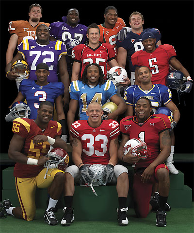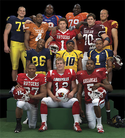 Left to right, top to bottom: Jake Long, lineman, Michigan; Ryan Clady, lineman, Boise State; Barry Richardson, lineman, Clemson; Sam Baker, lineman, USC; Limas Sweed, receiver, Texas; Jere Myito, placekicker, Rutgers; Cody Wallace, center, Texas A&M; Mario Manningham, receiver, Michigan; Steve Slaton, running back, West Virginia; DeSean Jackson, kick returner, California; Ray Rice, running back, Rutgers; Brian Brohm, quarterback, Louisville; Darren McFadden, running back, Arkansas.