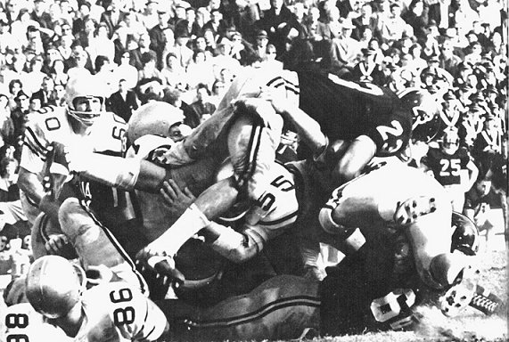 | Johnny Roland dives over the Tech pile. | |