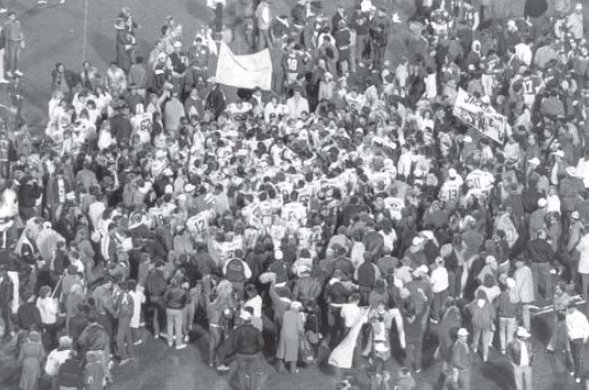 EMU fans celebrate the Hurons' upset victory. |