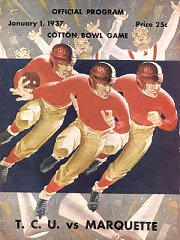 In the Fall of 1936, the Texas Centennial Exposition was held as the Fairgrounds in Dallas. The Exhibition ended in late November. On January 1, 1937, the first Cotton Bowl was played. It was the brainchild of Dallas oilman, J. Curtis Sanford. Marquette was led by Ray Buivid, who finished 3rd in the Heisman balloting. Opposing Buivid was the 4th place Heisman finisher, Sammy Baugh of TCU. TCU had finished 7-2-2 in 1936 following the national championship season of 1935. Marquette had gone 7-1 with wins over, Wisconsin, Michigan State and Mississippi. Entering the Cotton Bowl, TCU was ranked #16 and Marquette, #20.