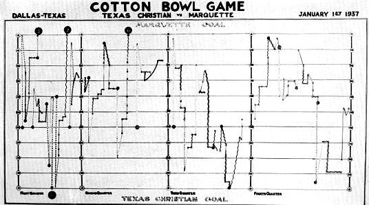 During the first half, when both teams were at full strength, the Frogs showed a net gain from scrimmage of 206 yards to 21 for the enemy and completed five out of twelve passes for 110 yards while Marquette was successfully executing two of five throws for ten yards. The Christians were making twelve first downs to three and finished the day with an advantage of eighteen to ten.