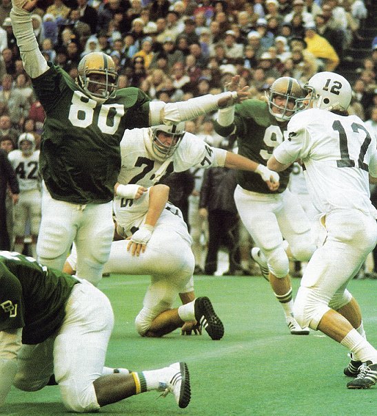 The onside kickoff bounded 10 yards all right, but charging Joe Jackson of the Lions met it on the run, broke through the still charging Green Wave and was gone for the touchdown. "They took it away from us in the fourth quarter," Teaff said. "I don't believe they are that much better than us, and I don't think we played to the best of our abilities. "However," he emphasized, "they are a great football team." Shuman finished his day's work by hitting 10 of 20 passes for 226 yards and Cefalo caught three of them for 102 yards. Donchez also had four catches for 50. Both teams did a lot of driving with little results in the first half, with both defensive bunches stiffening at opportune times. The Baylor defenders held at their own 14 to force a missed field goal early, caused a fumble at their 18 that set off BU's touchdown drive, held at their 34, and held again at their 9 to force a 25-yard field goal by Bahr. Baylor began the first scoring drive with 4:54 left in the first period when Tommy Turnipseede recovered a Donchez fumble on the Bruin 16. Tailback Steve Beaird popped loose for 20 on the first play, and Green was off. Jeffrey hit Beaird for a 7-yard gain on third and 6 at the Lion 34, and on two successive third-downs-and-3, Penn State jumped offside – and the 20 and again at the 9, Beaird knifed in from the 4 with just 41 seconds left in the first quarter to cap the 84-yard, 11-play trip. That was Baylor's only serious threat of the half, as they failed to move with a Penn State fumble at the Lion 40 in the second quarter. Penn State showed a number of offensive sets, including a wing-T, double-wing and straight-T in short yardage situations in putting up 491 yards total offense. "We moved off the line and off the ball as well as we have all year," coach Joe Paterno conceded. On the other side, the Lions shut down Beaird in the second half, limiting him to 12 yards on 7 carries in the final 30 minutes after he bore out 72 yards on 14 trips in the first half. Jeffrey did not have one of his better passing days, missing targets in the second half and finishing up with 7 of 19 for 135 yards and two interceptions. "Neal wasn't so sharp as he has been," Teaff conceded, "but we have nothing to be ashamed of in losing. "You are still the Southwest Conference champions," he told his team. "You learn something from everything." Though one of them might be that all dreams don't come true, the Bears have got to figure they're still way ahead of the game. Only the Big Sleep lasts forever. They realized most of theirs in a year. Some folks had been waiting 50.