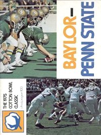 Only the Big Sleep lasts forever. The bowl-wise Nittany Lions of Penn State allowed the neophyte Bears to dream on peacefully for almost three quarters before setting off the alarm clock. It rang like Big Ben. And so, the Rude Awakening. Penn State rebounded from a 7-3 halftime Baylor lead and another Bruin advantage (14-10) midway of the third period to tack up a Cotton Bowl-record 41 points and head back East with a 41-20 victory in the 39th annual classic. The Lions met the challenge like lions. Grant Teaff's Southwest Conference champions, in their first Cotton Bowl appearance, played like old hands at this post-season business before the Eastern powers-that-be roared out for the second half, gained the lead, lost it, struck quickly to get it back and wore down the Bruins the rest of the way. The boat rocked in a 3-minute span of the third quarter. The Lions had taken the second-half kickoff and taken to the arm of quarterback Tom Shuman, the game's outstanding offensive player. Throwing strikes of 42 and 20 yards to his tight end Dan Natale, Shuman engineered an 80-yard drive that ended with fullback Tom Donchez (116 yards on 25 carries) diving over from the 1 for the first Lion lead of the game, 10-7, at 10:46 of the third. The scene now shifted to four minutes later. Baylor had punted and Penn State had moved from its 19 to a third-and-15 at the 36. Shuman dropped back, flipped a screen in the right flat to Donchez and the Penn State convoy went 64 yards to the end zone. But back up the field was a flag. Guessing it wasn't dropped casually, Shuman picked it up, threw it in disgust and, after a few words with an official, drew another flag. All this while Donchez was jumping up and down in the end zone. Well, instead of a TD, Penn State was penalized 15 yards for offensive interference (and loss of a down) and another half-the-distance penalty for Shuman's scene – back to the 12. OK, they punted and after three plays they were behind again. Baylor scored on a 36-yard pass play from Neal Jeffrey that was tipped on the 1 by PSU defender Mike Johnson and landed in the arms of Baylor's Ricky Thompson, who kept his eyes glued to the ball. The PAT made it 14-10 for the Bruins with 4:23 left in the third. That stood up less than a minute. Two plays prior, Baylor's free safety Kenny Quesenberry, who had been a defensive demon all day and was voted the top defensive star for the game, went out with a knee injury. Striking quickly, Shuman went deep on the second play after the kickoff and found standout freshman winger Jimmy Cefalo behind Scooter Reed – with no help from the safety – at the 9, and Cefalo sprinted in with a 49-yard TD reception. Penn State had regained the lead at a critical time (17-14) and the Bears had begun to faintly hear a ringing in their ears. The Lions kept the offense wide open and wore down the Bear defense the rest of the way, while Baylor began to make errors, pressing to get the lead back. Penn State scored again early in the fourth quarter, Baylor failed to move after the TD and the Lions clicked off a 68-yard, 9-play drive that featured the running of third-team halfback Neil Hutton. Cefalo also carried twice in the drive, for 21 yards and the final three, as the Lions moved to a 24-14 advantage. On their next series, they moved from their 29 to the Bear 16. Baylor stopped 'em and Chris Bahr booted a 33-yard field goal (27-14) with 6:17 left in the game. On the first play after the kickoff, Johnson, who had tipped that TD pass to Thompson earlier, atoned himself. He intercepted a Jeffrey pass on the BU 33 and carted it back to the 18. Aided by a pass interference penalty in the end zone, the Lions scored with 3:27 to go with Shuman going over from the two on a busted play, the kick making it 34-14.
