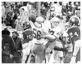 The first time Unis kicked his extra point, Notre Dame was penalized for illegal procedure. Unis made the second try and the delirious, frostbitten band of Fighting Irish fans stormed the frozen field (video).