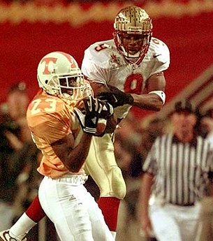 The play was called 69 All Go, meaning that three wideouts ran straight down the field. "Their defensive backs had been having trouble jamming us all night," Tennessee flanker Jeremaine Copeland, one of those who ran deep, said after the game. As the pass fell, Florida State cornerback Mario Edwards leaped and missed. Price caught the ball and ran joyfully into Volunteers history. It was a perfect throw by a quarterback who came to Tennessee from a horrible Mobile slum and had the unenviable task of following in the footsteps of folk hero Peyton Manning.