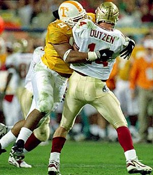 Tennessee's defense: Goodrich intercepts in front of Peter Warrick and was off to the races (left). Walker sacks Outzen (right). |