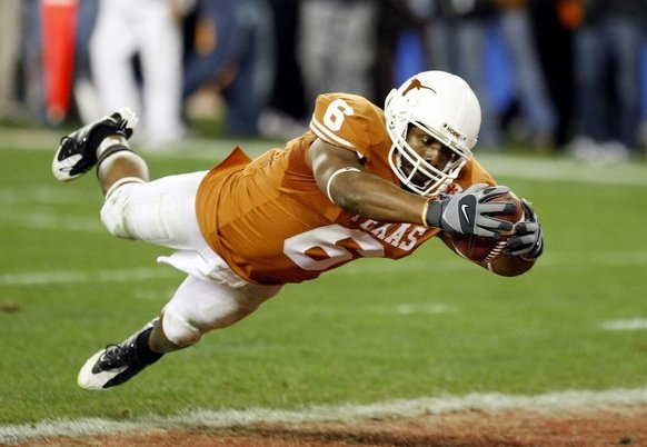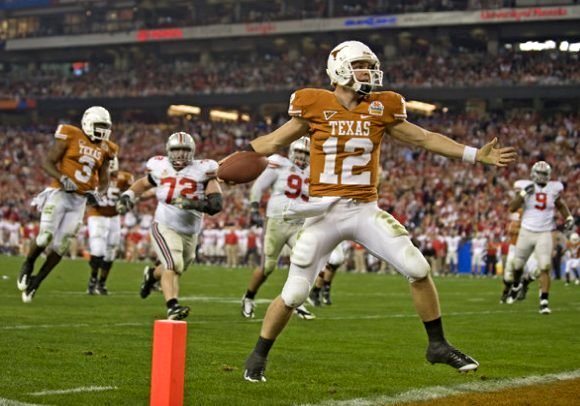 McCoy, the Heisman Trophy runner-up, calmly led the Longhorns 78 yards in 11 plays and 1:42 without calling a timeout. On the touchdown, Cosby caught a short pass, slipped a tackle and sprinted toward the goal line before diving into the end zone (video).