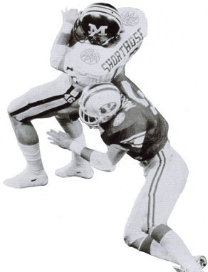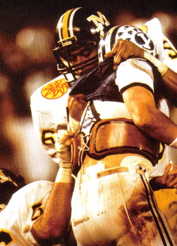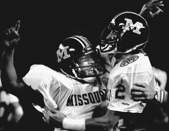 Missouri intercepted Young early and often. Here Jerome Caver and Terry Matichak celebrate a pick. |