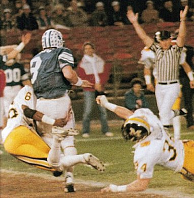 | Steve Young scores winning TD. | Warren Seitz fires pass. |