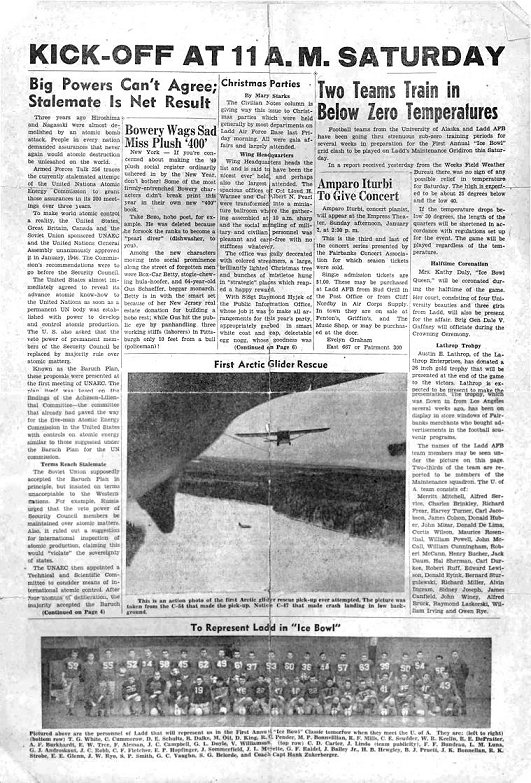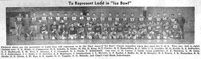 This farthest-north bowl game was played in 25 degrees below zero weather at Ladd's Maintenance Squadron gridiron, near Fairbanks, before close to 1000 thrilled and chilled spectators, who found the Ice Bowl somewhat different from other bowl games held that day.