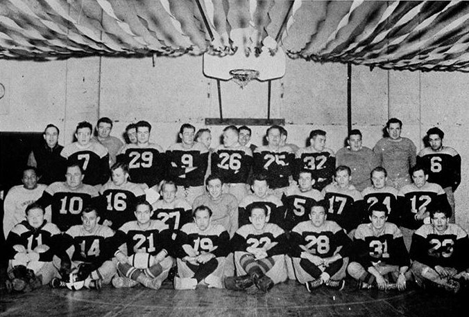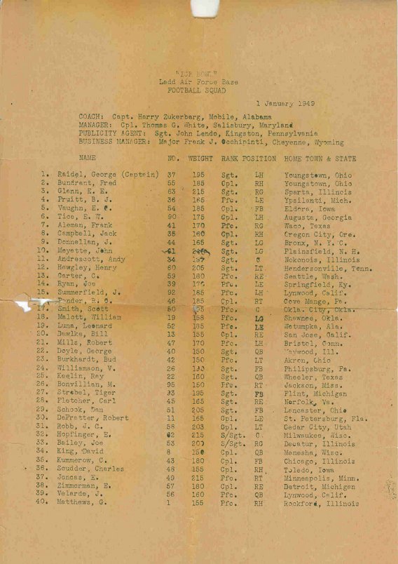 The biggest thrill for the crowd came late in the second quarter when Ladd halfback, Sgt. George Raidel, flipped a long pass from his 47-yard line to Sgt Ray Keelin, quarterback, who gloved it on the University 13-yard line and romped down the sidelines for what looked to be a touchdown. Sharpe-eyed officials, however noted that Keelin had left a footprint in the coal dust sideline at the 10-yard marker and brought the ball back to that point. Ladd then drove to the 7, but the end of the half halted the scoring threat.