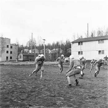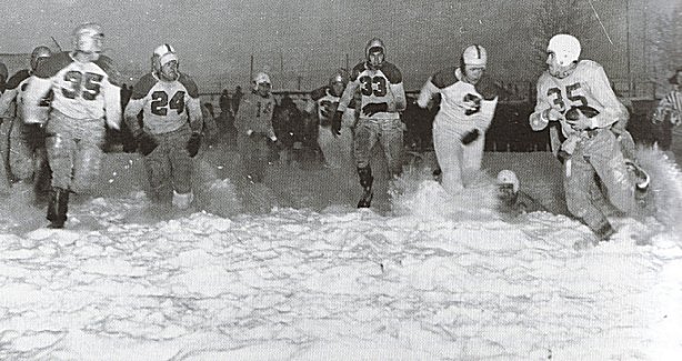 Action from the 1950 Ice Bowl. UAF runner tries to elude almost entire Ladd defense.