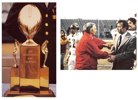 The Independence Bowl trophy (left) and Maxie Lambright congratulates Pat Dye (right). |