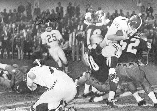 Jefferson booted a 25 yard goal a moment later after getting the ball on a fumble by WVU halfback John Piscorik and then, before the half was over, the slippery Coleman wiggled his way through a horde of WVU tacklers and scooted 53 yards for a touchdown, running the score to 19-0.