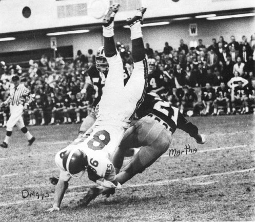 Roy Jefferson is pulled down by Jim Sypult. |