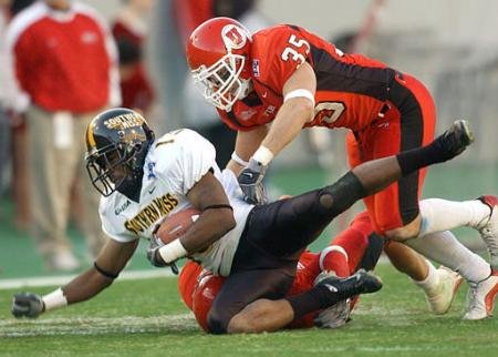 USM wide receiver Kenneth Johnson is brought down by Utah's Dave Revill (35) and Eric Weddle. |