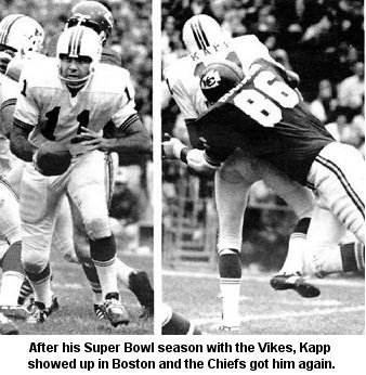 straight Western Division title by defeating Chiefs, 20-6. Ed Sharockman intercepted Joe Kapp three times in the Vikings’