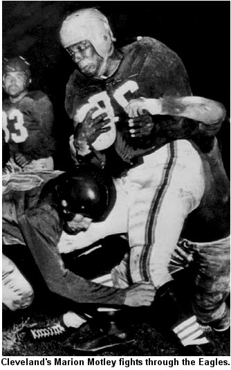 The Eagles didn't give up, marching to a first down at the Cleveland 6. Somewhat surreptitiously, Brown sent in fullback Motley at linebacker. The 232-pound giant (by standards of the day) smothered four straight running plays, and the Eagles could have slunk home right there.