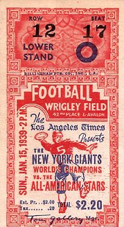 Now, on Monday, Jan. 16, 1939, we know that the city of Los Angeles was wrong, and the big league football franchises had better stay where they are. Because yesterday, at Wrigley Field here, a football game which brought together the greatest collection of stars ever gathered at one time was played before a crowd that made no one rich. Despite tremendous publicity and a charity angle, there were fewer than 35.000 customers in the stands when the New York Giants defeated the hand-picked All-Americans, 13 to 10.