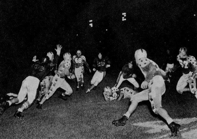 He gained a total of 165 yards through and around the Bears. Most of his yardage came on passes from George Ratterman, the former Notre Dame flash who quarterbacked the Stars and completed eight of 12 passes. But Buddy also proved his mettle in contact work as he stepped through slim holes in the gigantic Bear line for two good runs.