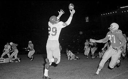Alex Webster catches pass with Del Shofner (27) defending.