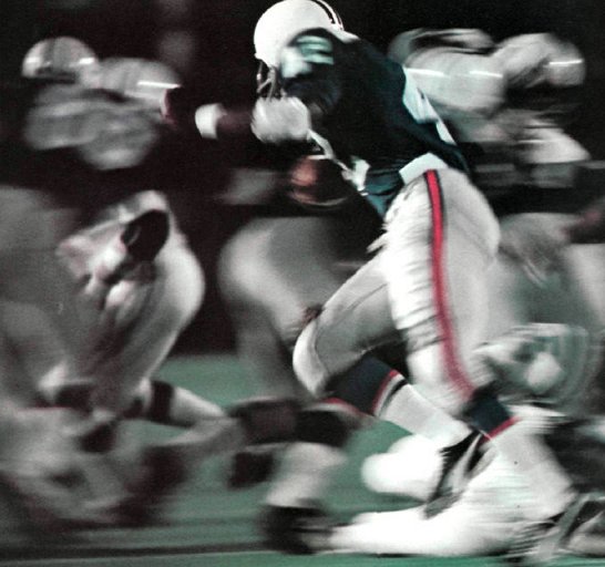 The Bears and All-Stars scrimmage the week before the big game. Leon Burns of Long Beach State carries behind blocking of John Mooring (71) with Dan Dierdorf (on his side) and Elmo Wright (12). The Bears' Ross Brupbacher (31) pursues.