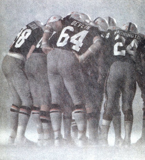 Archie Griffin is brought down by Steve Furness as Richard Todd (14) watches in background. |