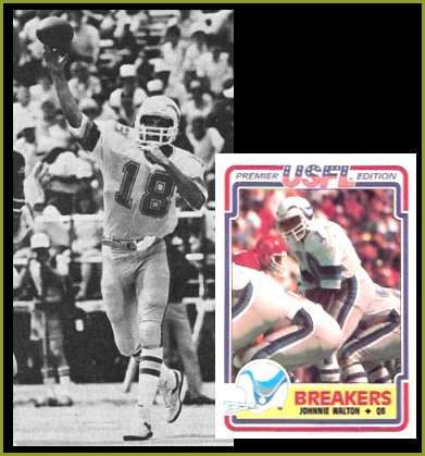 Johnnie Walton was a talented quarterback with all the physical tools required by the NFL -- 6'2", 200 pounds, a bazooka for an arm. But NFL scouts turned a cold shoulder for two reasons -- Walton was from a small college and he was black. Black quarterbacks just didn't have a chance in the NFL of the late 60s and early 70s. He wasn't drafted by anyone and he was cut twice by the Rams and once by the WFL's Chicago Fire. He was forced to play for minor-league outfits in Indianapolis and Columbus. Then in 1975, he signed on with the WFL's San Antonio Wings and had a great season, leading the league in completions, attempts, passing yards and touchdown passes. His performance was good enough to earn him a spot with the Eagles from 1976 through 1978. After coaching his alma mater, Elizabeth City State College in North Carolina, he came back and tore up USFL defenses like he did those of the WFL, setting league standards along the way.