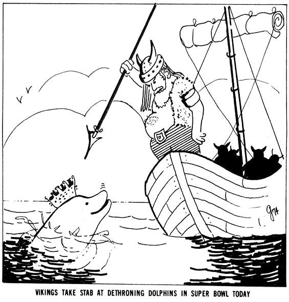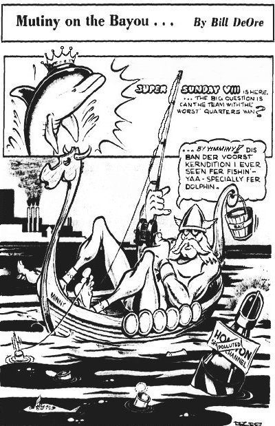 A major story of Super Bowl VIII was the Vikings having to practice at an inadequate high school playing field, while the Dolphins practiced at the Houston Oilers' facilities. Vikings' Coach Bud Grant was enraged and spoke out. He was reprimanded by Pete Rozelle.
