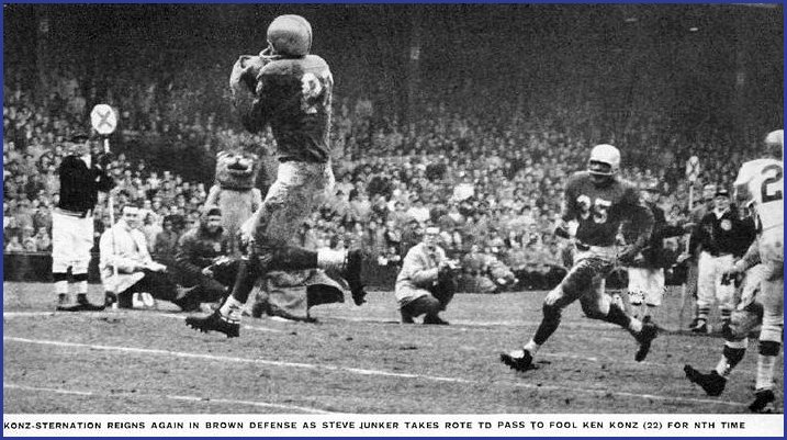 Downfield, near the sidelines, he fired it at rookie end Steve Junker, all alone on the six. Junker gathered in the ball and scored untouched.