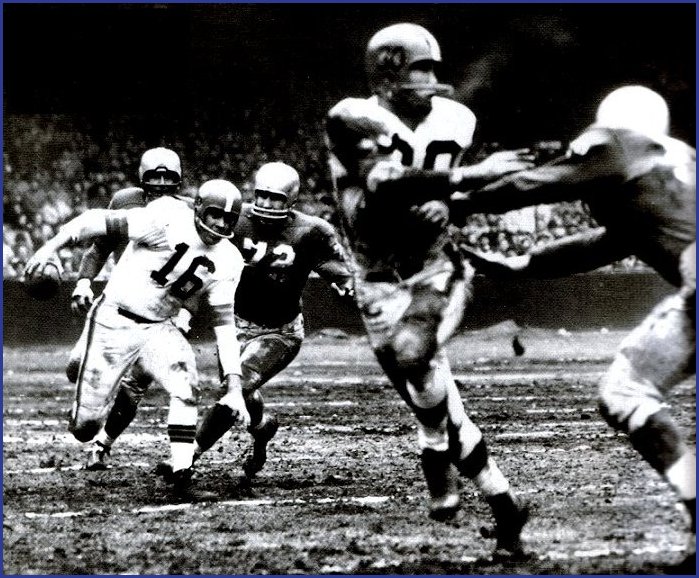 With the ball on the Cleveland 26, Rote knelt as it to hold for the kicker, Jim Martin. Rote took the ball from center. Martin swung his leg. But then- to the complete astonishment of the Cleveland defenders- Rote ran with the ball to his right.