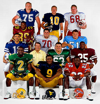 Left to right, top to bottom: Mike Pfeifer (75), offensive lineman, Kentucky; Robbie Keen (10), place kicker, California-Berkeley; Jake Young (68), center, Nebraska; Darrell Thompson (39), running back, Minnesota; Doug Glaser (70), offensive lineman, Nebraska; Pat Crowley (51), offensive lineman, North Carolina; Clarkston Hines (12), wide receiver, Duke; Don Nehlen, Coach of the Year, West Virginia; Bob Kula (63), offensive lineman, Michigan State; Darren Lewis (25), running back, Texas A&M; Chris Oldham (2), kick returner, Oregon; Major Harris (9), quarterback, West Virginia; Emmitt Smith (22), running back, Florida.