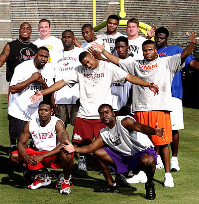Left to right, top row: Carlos Polk, linebacker, Nebraska; Nick Harris, punter, California; Derrick Gibson, defensive back, Florida State; Andre Carter, lineman, California; Richard Seymour, lineman, Georgia; Justin Smith, lineman, Missouri; Alex Brown, lineman, Florida. Middle row: Jamie Winborn, linebacker, Vanderbilt; Fred Smoot, defensive back, Mississippi State; Saleem Rasheed, linebacker, Alabama; Robert Carswell, defensive back, Clemson. Bottom row: Jamar Fletcher, defensive back, Wisconsin; David Allen, kick returner, Kansas State.