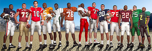 Left to right: Clarence Farmer, Running Back, Arizona; Brett Williams, Offensive Lineman, Florida State; Eli Manning, Quarterback, Mississippi; Kelley Washington, Wide Receiver, Tennessee; Charles Rogers, Wide Receiver, Michigan State; Derrick Dockery, Offensive Lineman, Texas; Bernard Berrian, Wide Receiver, Fresno State; Jon Stinchcomb, Offensive Lineman, Georgia; Damon Duval; Punter/Placekicker, Auburn; Al Johnson, Center, Wisconsin; Lee Suggs, Running Back; Virginia Tech; Steve Sciullo, Offensive Lineman, Marshall; Onterrio Smith, Kick Returner, Oregon.