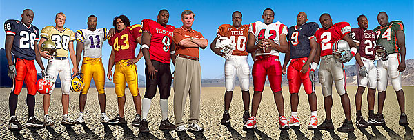Left to right: Eugene Wilson, Defensive Back, Illinois; Dan Dyke, Anson Mount Scholar/Athlete, Georgia Tech; Bradie James, Linebacker, Louisiana State; Troy Polamalu, Defensive Back, USC; Aaron Hunt; Defensive Lineman; Texas Tech; Mack Brown, Coach of the Year, Texas; Cory Redding, Defensive Lineman, Texas; E.J. Henderson, Linebacker, Maryland; Clifton Smith, Linebacker, Syracuse; Mike Doss, Defensive Back, Ohio State; Sammy Davis, Defensive Back, Texas A&M; William Joseph, Defensive Lineman, Miami.