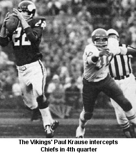 straight Western Division title by defeating Chiefs, 20-6. Ed Sharockman intercepted Joe Kapp three times in the Vikings’